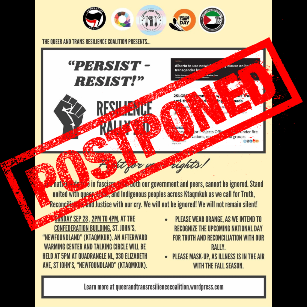 The Queer and Trans Resilience Coalition (QTRC) is an activist coalition that formed out of necessity in January of 2025, when marginalized people within the urban community of St. John’s, Ktaqmkuk, identified an increasingly dangerous political and social climate. So as not to reenact the systems of power and oppression the QTRC aims to combat, a set of guidelines, as outlined below, will be the guiding principles leading this coalition.